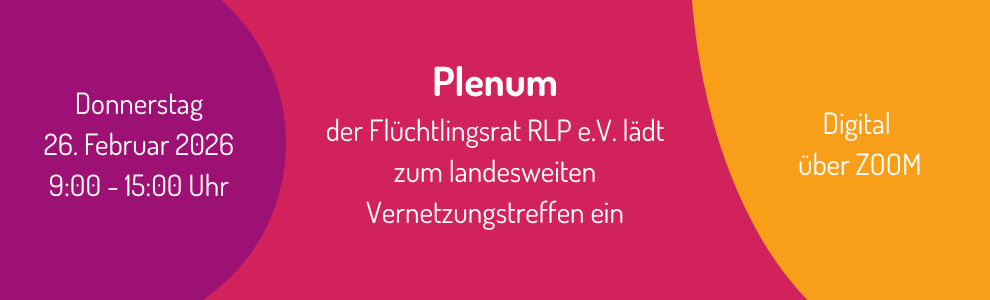 Save the date: Am Dienstag, den 25. August 2026 lädt der Flüchtlingsrat RLP e.V. zu einem landesweiten Vernetzungstreffen nach Mainz ein. Unser so genanntes Plenum ist für alle Interessierten offen, kostenlos und bedarf keiner Anmeldung.